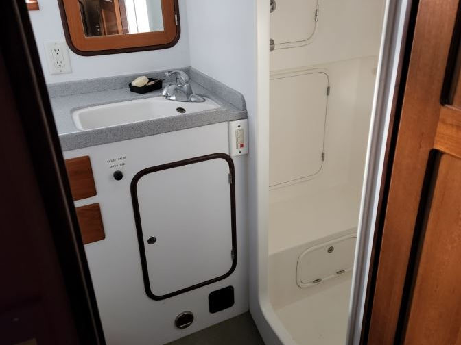 The yacht has a 300 gallon fresh water capacity supplying hot and cold water to the two heads and the galley; new pressure pump. There is a Sea Recovery water-maker rated at 53 gallons/hr. (the owner has not used the water-maker and it may need attention); hot water heater (2022). She has two Raritan electric heads each is fitted to a 25 gallon holding tank with a ‘Y’ valve for overboard discharge. The after head has new plumbing and a ‘Y’ valve; new check-valve and mascerator pump. Each head has a shower, sink and vanity.