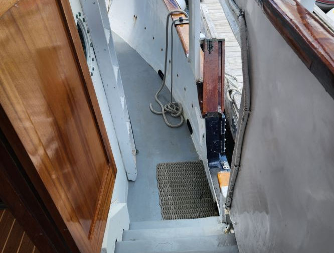 CONSTRUCTION: Flag blue Airex cored fiberglass hull, gray decks and white deck-houses; long skeg keel with fully supported rudder. She is a raised pilot-house design. The pilot-house has ‘Dutch’ access doors port and starboard; heavy rub-rails; asymmetric cabin arrangement with fore-and aft covered side deck on the port side. The deep cockpit is partially covered by the boat deck. Welded stainless steel rails forward of the pilot house. The fore deck has a substantial (carbon fiber sheathing over wood) mast with lifting boom and riding sail; Wesmar 10 HP, 24 volt, electric bow thruster (1999); Naiad active fin stabilizers (1996 w/ updates); hydraulic steering; emergency tiller; 10 bronze ports (2007).