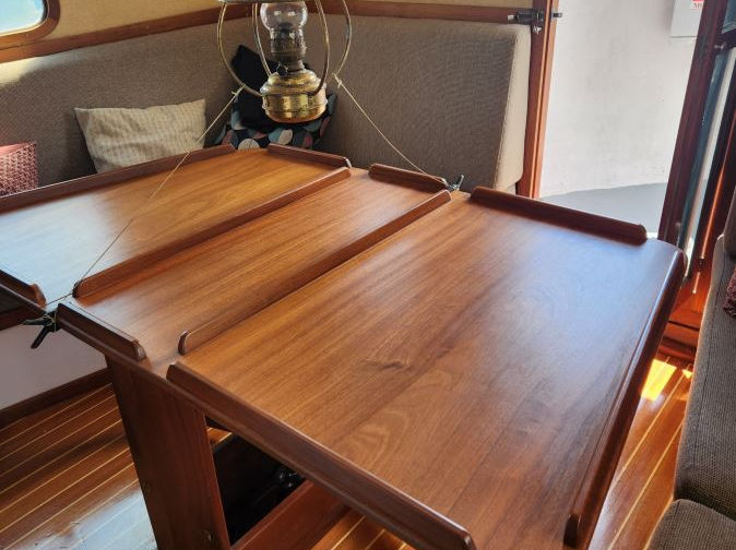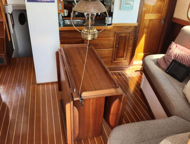 The yacht has a Herreshoff style interior with painted bulkheads teak and mahogany trim, teak and holly sole; vinyl headliner; beige fabric upholstery in the main salon. She has 3 Cruisaire air-conditioning units (16,000 BTW each) plus a bus-type heater which runs off of the engine.